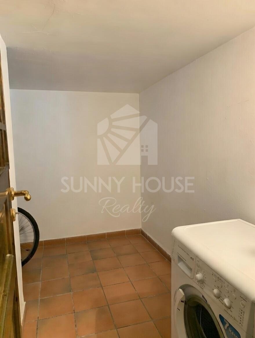 The basement level comprises two double bedrooms, both equipped with air conditioning and radiators, a second bathroom, a storage room, and a laundry area. One of the bedrooms features an elegant fireplace, adding warmth and character to the space.