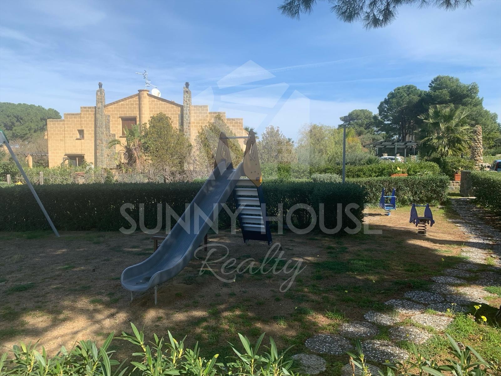The residence offers numerous amenities, including concierge service, direct access to two private beaches, and two shared swimming pools (one for adults and one for children), both equipped with umbrellas and sun loungers. There is also a children’s playground with slides and well-maintained green areas.